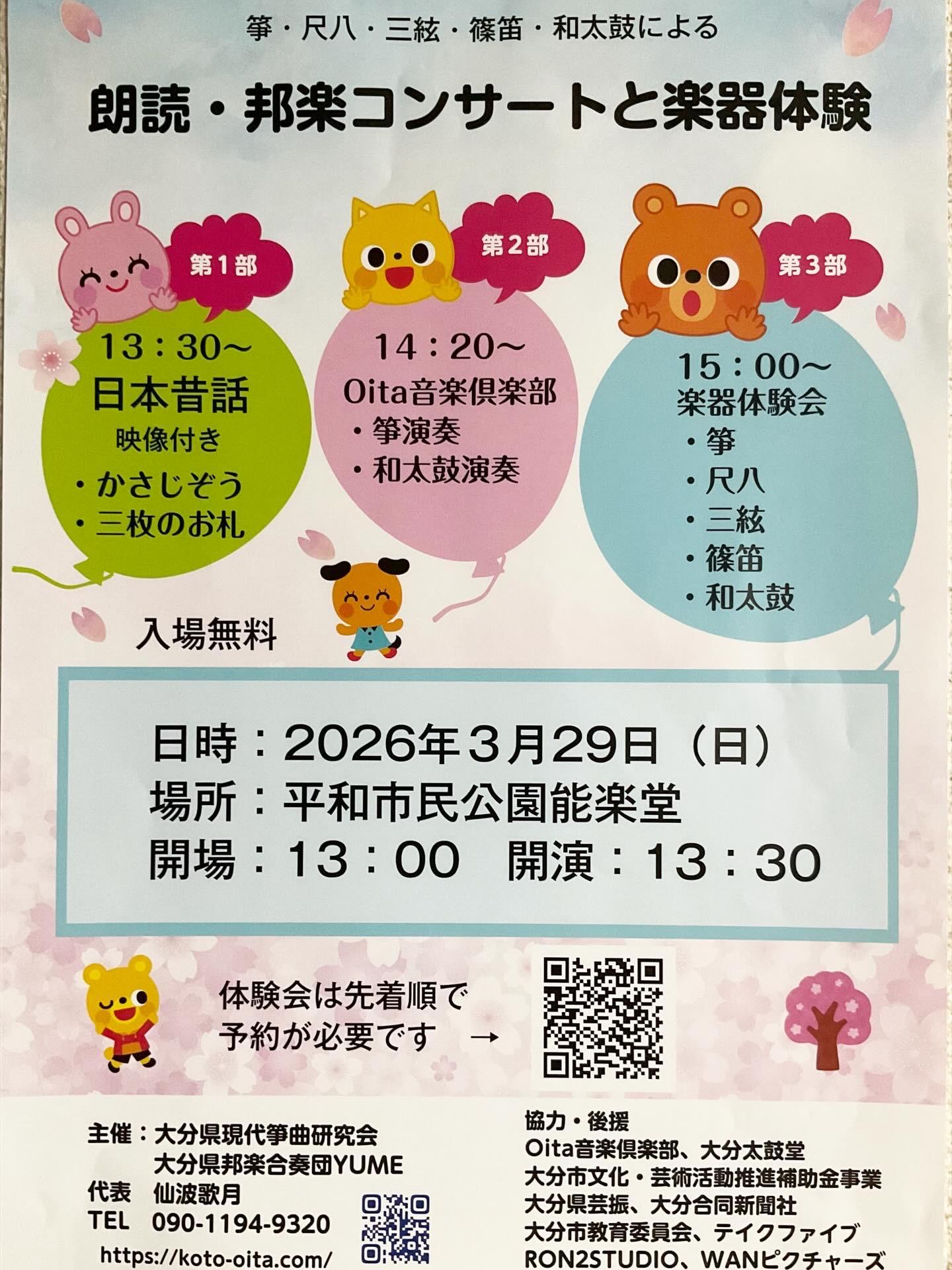 朗読・邦楽コンサートと楽器体験のイベントです。詳細はチラシをご覧ください。